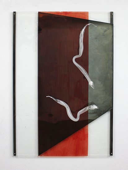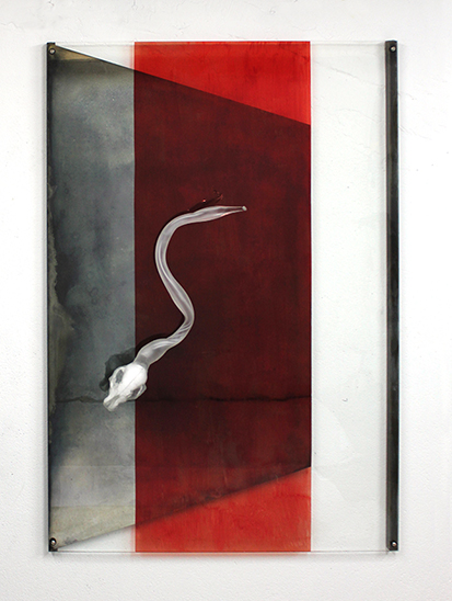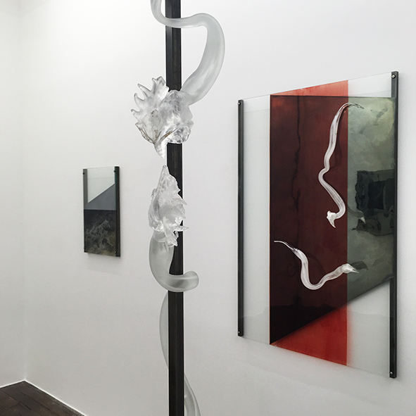 Verre, rouge de cuivre, argenture de miroir, peinture noire, acier, pâte de verre, os, verre soufflé
