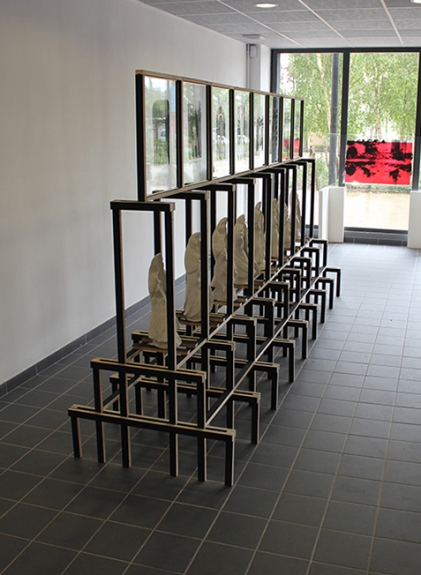 Argile, contreplaqué, peinture, peinture photosensible, laiton, verre. 180 cm x 70 cm x 300 cm